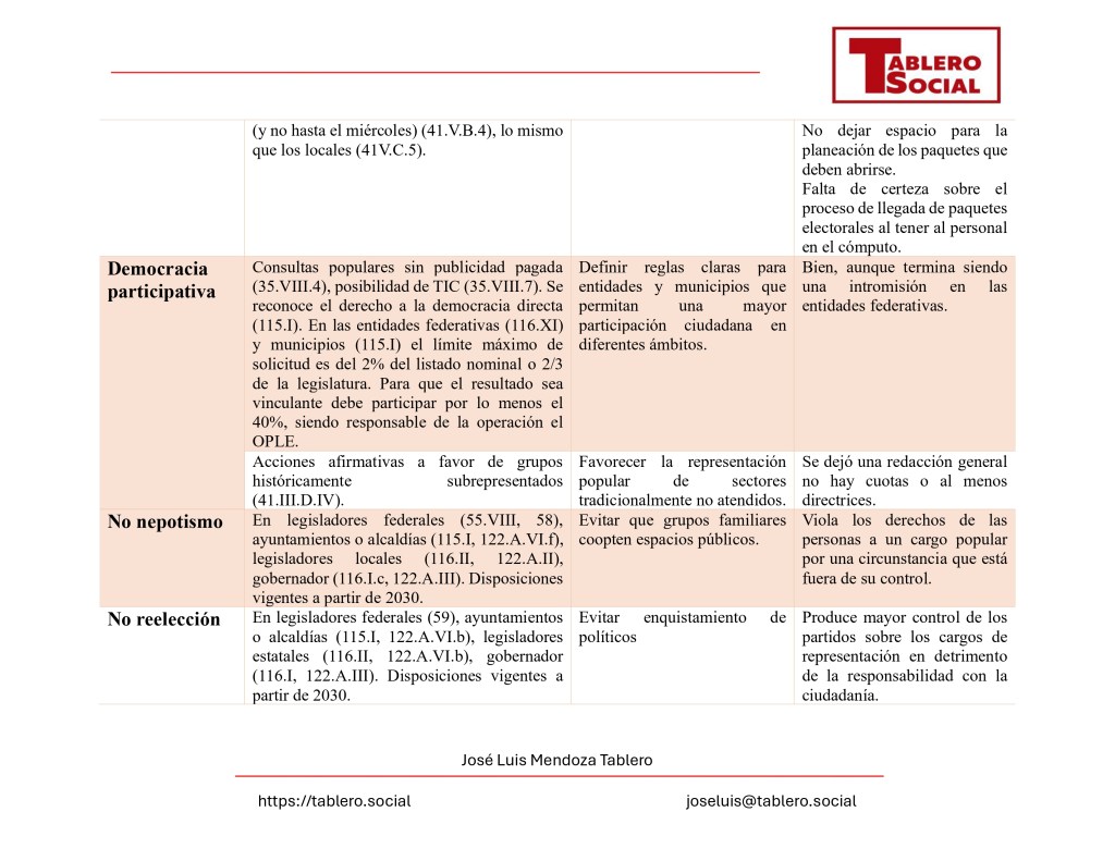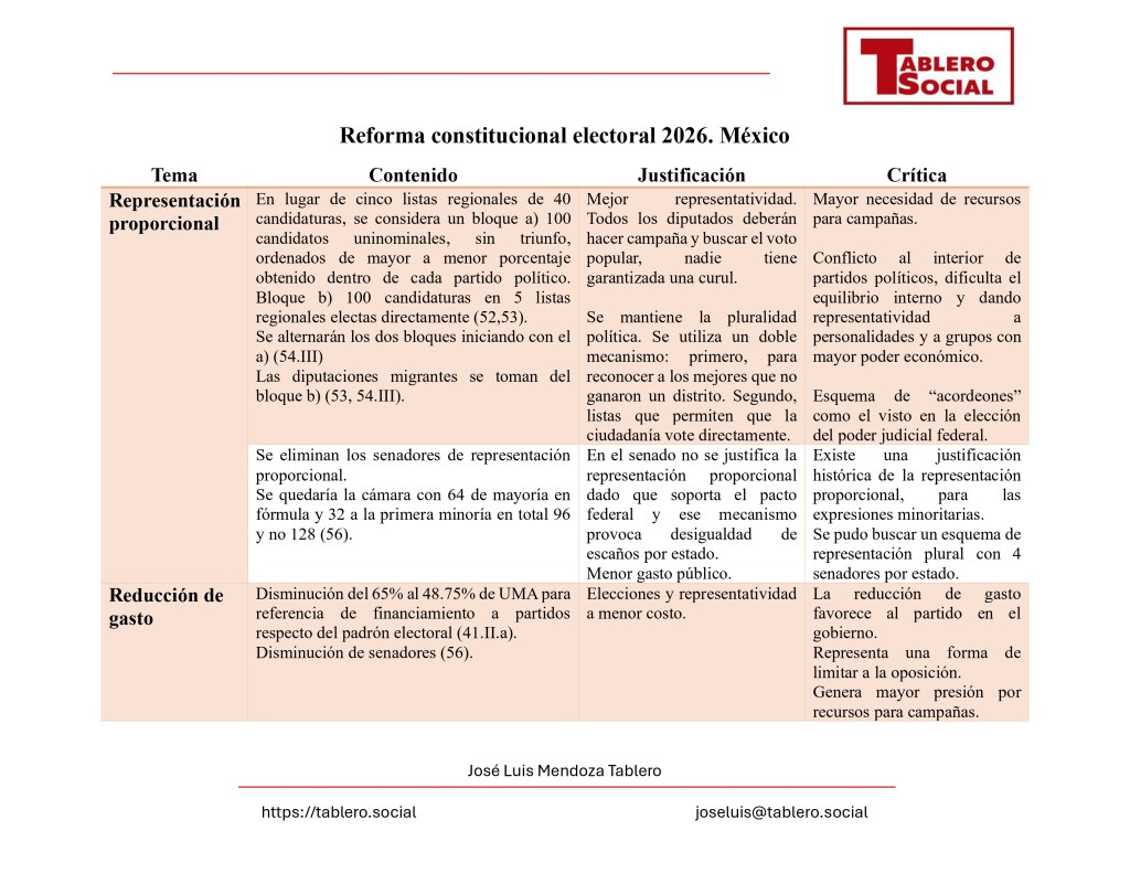 Críticas: Los opositores señalan que la votación directa generaría conflictos internos en los partidos, favorece a candidatos con más recursos económicos y debilita la representación de las minorías políticas. En el caso del senado hay una razón histórica para la existencia de la representación proporcional y en todo caso se pudieron buscar mecanismos de equilibrio con 4 senadores por entidad federativa.