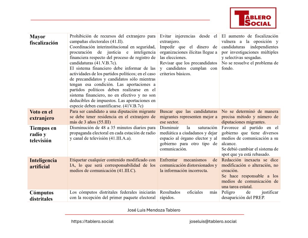 Críticas: Se argumenta que la reducción del financiamiento público favorece al partido en el gobierno y limita la capacidad de competencia de la oposición. Además, un aumento en la fiscalización podría usarse de manera selectiva y sesgada contra adversarios.