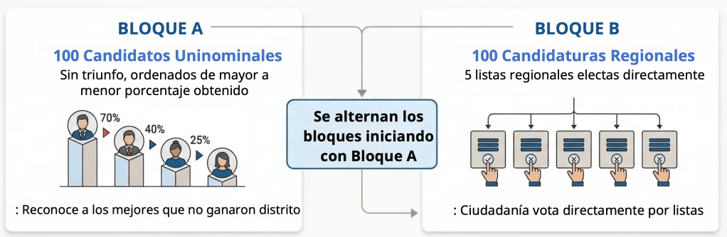 - Bloque A (100 escaños): Se conformaría con los 100 candidatos de cada partido que, habiendo competido por un distrito, no ganaron pero obtuvieron los porcentajes de votación más altos.